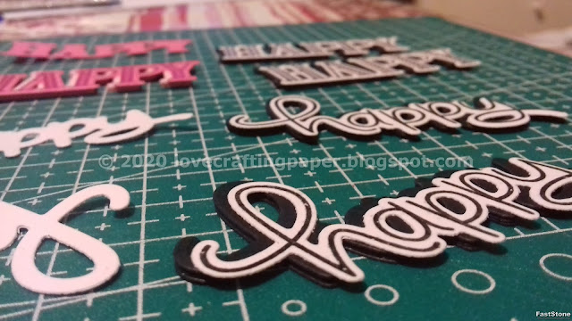 As regards "happy", first I stamped and die cut this word, then I just die cut it five times and glued all the pieces together to give more dimension to the word.