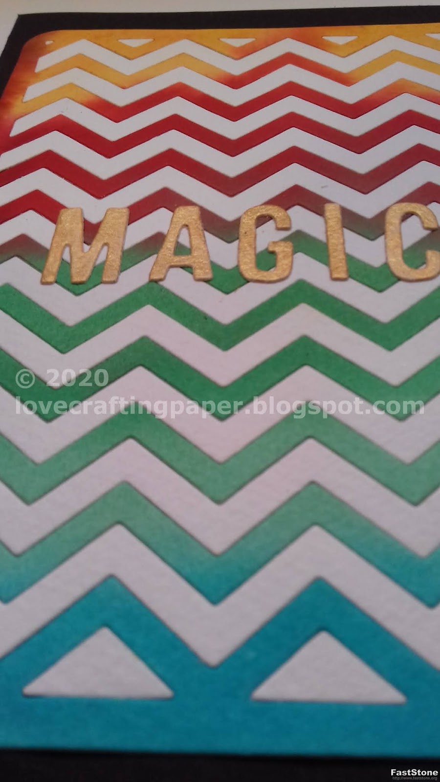 Prima ho creato uno sfondo arcobaleno con i tamponi Distress, su cui ho spruzzato un po' di acqua, poi ho fatto asciugare bene e ho fustellato questo schema a zigzag nel cartoncino arcobaleno e in uno bianco.