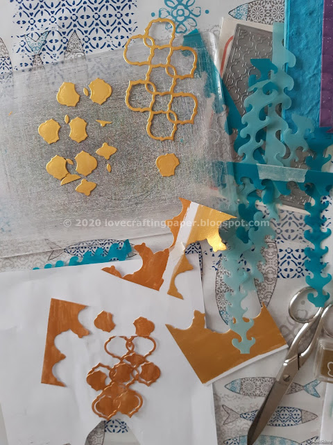I have made this decoration by colouring a white cardstock with two shades of golden watercolour. These months I have used them a lot. If you click on the label "gold" on the left column of my blog you can see what I have made before. I used this die in a bunch of Eastern design cards.